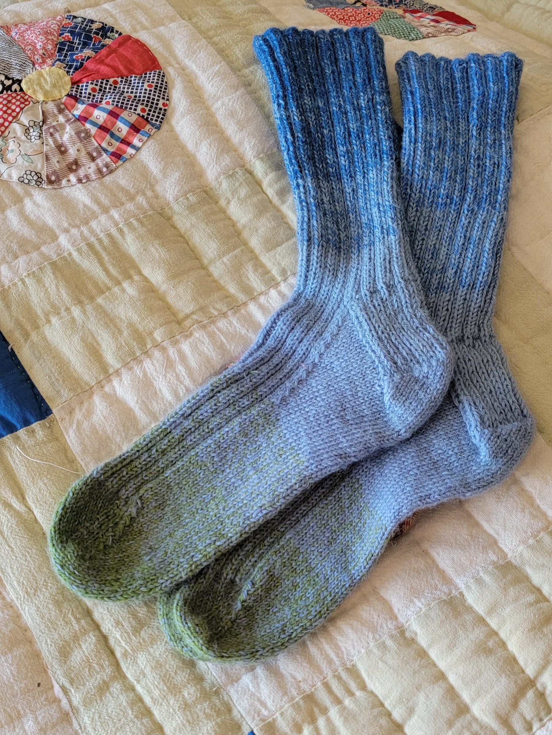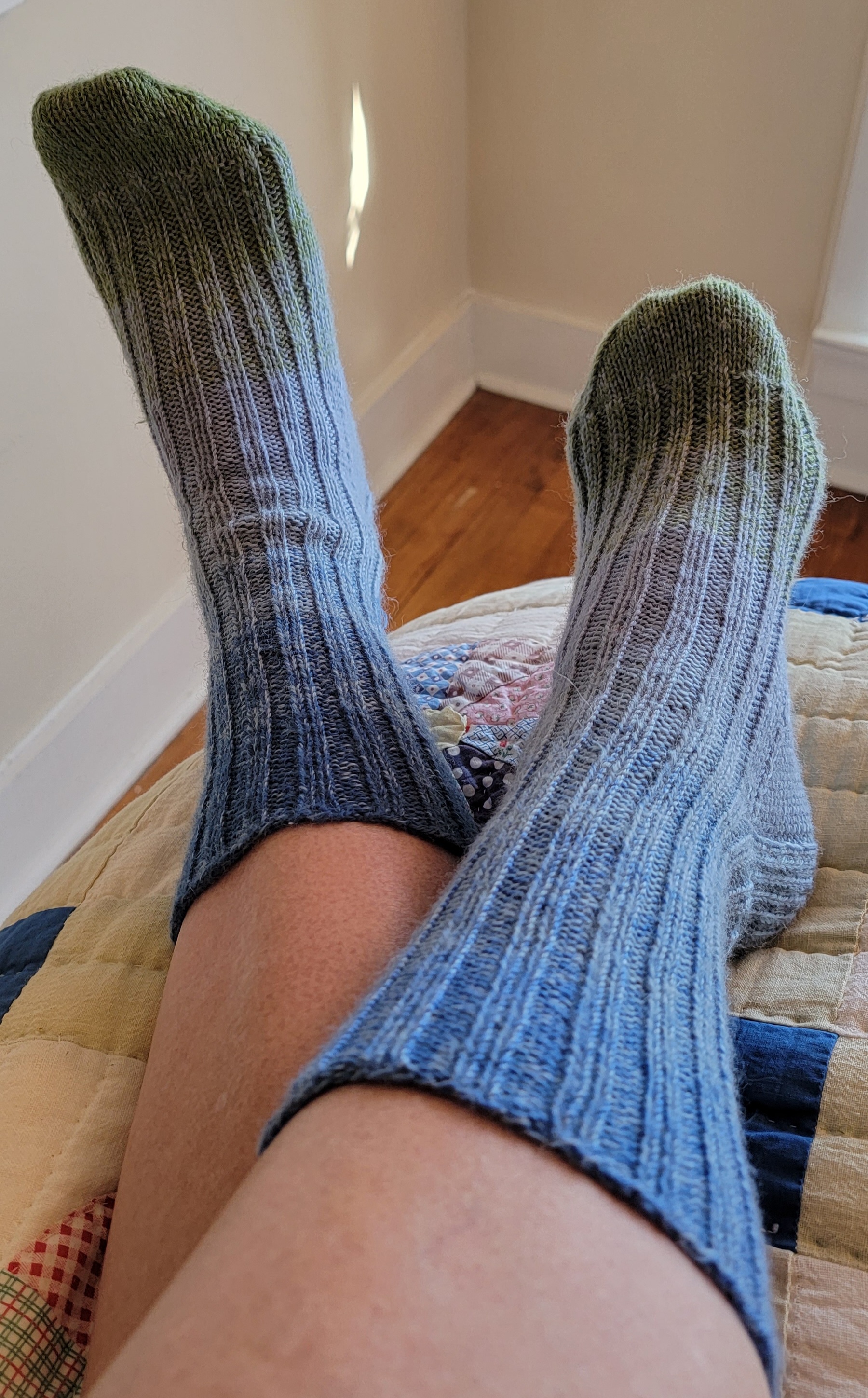 My friends, Tom and Stephanie, invited me over for dinner this week. They make dinner and I bring dessert and then we talk and laugh for hours! We hadn’t been able to see each other since mid-December so I brought their Christmas gifts as well. When Stephanie said, “and here is yours!” I was giddy. I love presents…giving and receiving. It is not the material gift but the time and thought involved -how special that someone spent their energy to think what you might enjoy. I opened my bag and felt a soft bundle wrapped in tissue paper. I squeezed it trying to guess the contents and then I gave in and tore the paper off. I saw a lovely pair of wool socks and gasped, “did you make these for me?” and Stephanie confirmed that indeed she had knitted them herself. I was sooooo happy – I love socks! My dear friend, Sara, has a long tradition of giving me a “sock box” for Christmas. I consider socks one of life’s little luxuries, and now I was holding an exquisite pair knitted just for me. Stephanie said, ” I realized after they were done how right they were for you, green in the toes and blue at the top – like you – your feet grounded in the earth and your head in the clouds!” We laughed as indeed she knows me.